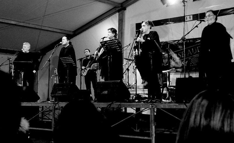 Los amigos cantores del grupo ARAPA nos hicieron el honor de cantar una canción compuesta por ellos “al estilo quilapayún” según nos dijeron. “Listo no más” respondimos y le dimos con ellos en el estribillo, después nos acompañaron en “La muralla” y terminamos todos juntos con el público de pie comulgando con el pueblo unido jamás será vencido.